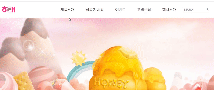 뎁스1은 네비게이션 메뉴의 최상위 항목으로 이 항목들은 화면에 항상 보이며, [제품소개],[달콤함 세상],[이벤트],[고객센터],[회사소개]가 이에 해당된다.