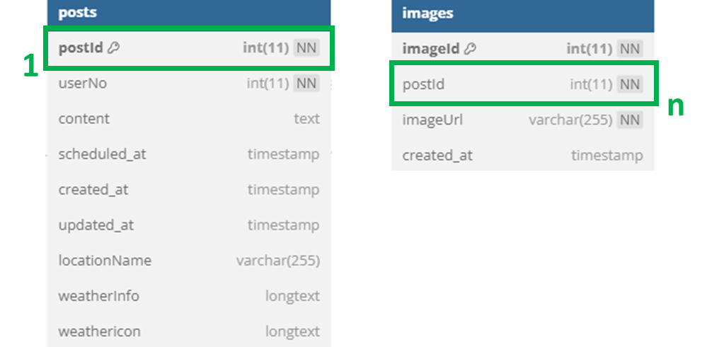 - images 테이블 - postId : 게시물 ID (Foreign Key)