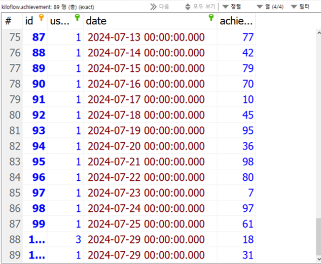 1 ) 특정 사용자가 특정 날짜에 등록된 달성률(achievement) 기록이 있는지 확인